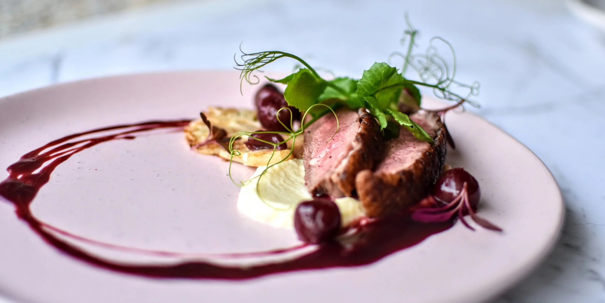 To serve, place a generous spoonful of cauliflower puree onto each plate. Top with roasted cauliflower steaks. Drizzle sour cherry sauce in a circular pattern. Slice duck lengthways and place on top of cauliflower. Garnish with pea tendrils. Serve and enjoy!